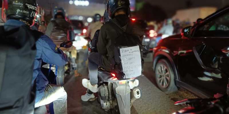 Selain membawa barang-barang yang berlebih hingga berpenumpang lebih dari 1 orang, terlihat pula pemudik yang menempelkan sebuah kertas yang bertuliskan dan berisi kata-kata jenaka maupun kegalauan.