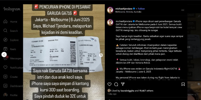 "Semua bukti lokasi menunjukkan iPhone saya berpindah ke hotel tempat kru GA716 menginap, lalu dibuang ke sungai. Saya hanya ingin keadilan. Bantu sebarkan agar suara saya sampai ke pihak yang bertanggung jawab," tulis Michael.
