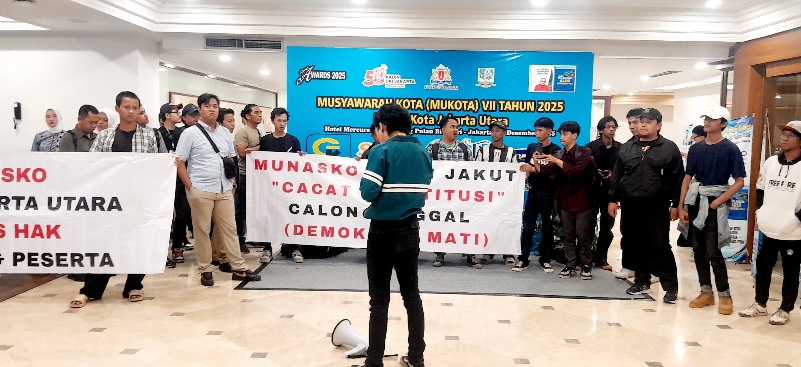 Massa menegaskan bahwa pelaksanaan Mukota Kadin Jakarta Utara tidak konstitusional, melanggar Anggaran Dasar dan Anggaran Rumah Tangga (AD/ART), serta sarat rekayasa pencalonan.
