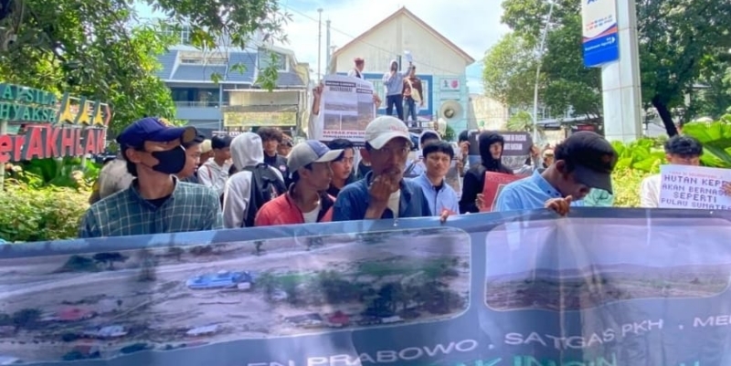 Dalam aksi tersebut, massa membentangkan spanduk bertuliskan: “Bapak Presiden Prabowo, Satgas PKH, Menteri Kehutanan, Kami Tidak Ingin Kepulauan Riau Mengalami Bencana Seperti Sumatra.”