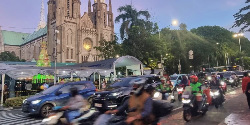 Suasana ruas jalan depan pintu masuk utama Gereja Katedral telah padat merayap, Rabu malam, 24 Desember 2025. (Foto: RMOL/Ahmad Satryo)