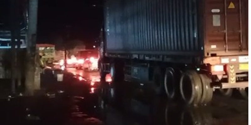 Hal tersebut dikarenakan jalanan rusak dan berlubang ditambah hujan deras sehingga membuat kendaraan terpaksa menjalankan kecepatan dengan pelan yang mengakibatkan penumpukan volume kendaraan.