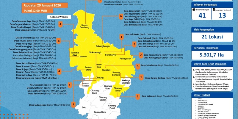 Badan Penanggulangan Bencana Daerah (BPBD) Kabupaten Bekasi mencatat total ada 41 desa yang berada di 13 kecamatan tergenang banjir.