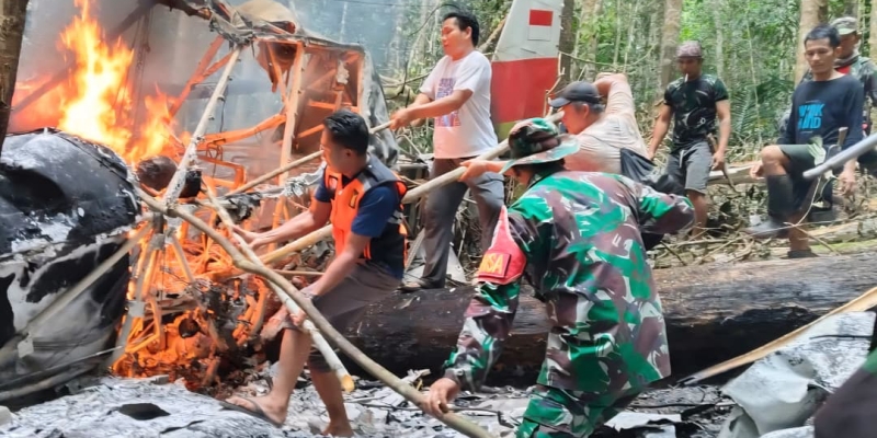 Bangkai pesawat ditemukan Satgas Pamtas RI-Malaysia Yonarmed 4/Prh dalam kondisi rusak parah dan terbakar.