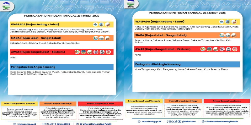 BMKG juga memperingatkan bahwa besok, Kamis 26 Maret 2026, Jakarta berpotensi diguyur hujan sedang hingga lebat.