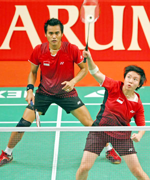 Peraih medali emas SEA GaÂmes 2011 ini tumbang, setelah diÂkalahkan pasangan Denmark, Denmark Thomas Laybourn/KaÂmilla Rytter Juhl 17-21 dan 13-21 di Di Yuan Shen GymnaÂsium, Shanghai, China, kemarin.