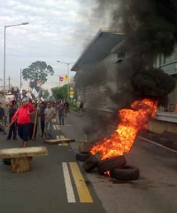 Satu unit kendaraan water cannon akhirnya dikerahkan untuk memadamkan beberapa ban bekas yang dibakar. Untuk membubarkan massa, petugas juga sempat menembakan gas air mata