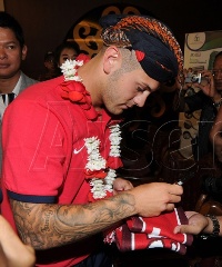 Wilshere yang kepanasan malah mendapat hadiah belangkon dari Chief Executive Officer (CEO) M-Pro Sports and Entertainment, Raja Sapta Oktohari.