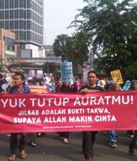 Massa yang tergabung dalam Gerakan Menutup Aurat Indonesia (GEMAR) itu menggelar aksi kampanye Gerakan Menutup Aurat Internasional di Bundaran Hotel Indonesia, Jakarta Pusat, Minggu (16/2) pagi.