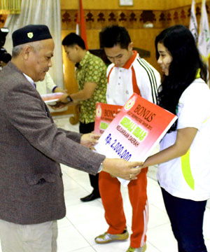 Penyerahan secara simbolis dilakukan di Hotel Grand Sahid Jaya, Jakarta, kemarin. Total bonus yang digelontorkan sebesar Rp 54,1 miliar untuk 821 jumlah atlet, pelatih, asisten pelatih melalui Kementerian Pemuda dan Olahraga (Kemenpora). Sekretaris Kementerian Pemuda dan Olahraga Alfitra Salam menjelaskan, bonus itu diberikan kepada 555 atlet, 260 pelatih, dan enam asisten pelatih.
