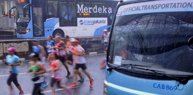 Ribuan pelari melintasi kendaraan bus Big Bird di jalan Gajah Mada kawasan Harmoni dalam acara Mandiri Jakarta Maraton yang diadakan di Jakarta, Minggu (23/10). Blue Bird berpartisipasi pada Mandiri Jakarta Marathon, sebagai official transport partner. RIZKISYAHPUTRA/RM