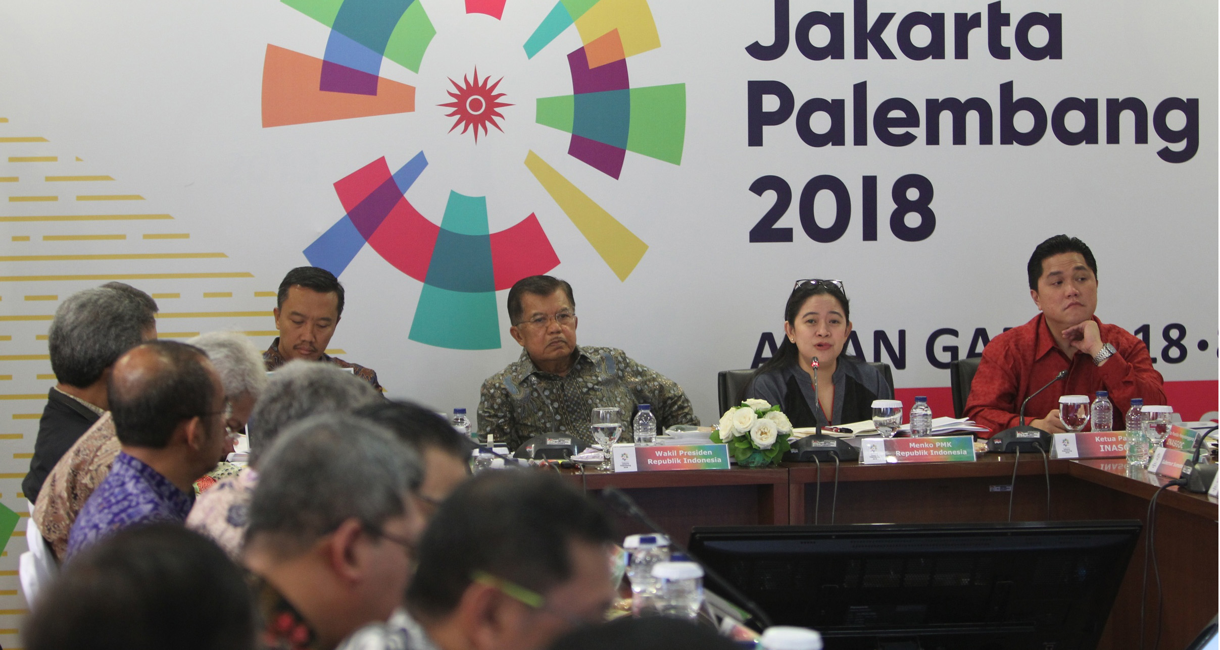 Rapat yang dipimpin Wakil Presiden Jusuf Kalla itu dihadiri oleh sejumlah pejabat terkait, diantaranya Menteri Pemuda dan Olahraga Imam Nachrowi, Menteri Komunikasi dan Informatika Rudiantara, Gubernur Sumatera Selatan Alex Noerdin, Presiden Panitia Pelaksana Asian Games 2018 (INASGOC) merangkap Ketua Umum Komite Olimpiade Indonesia (KOI) Eric Thohir, serta sejumlah pejabat lainnya.