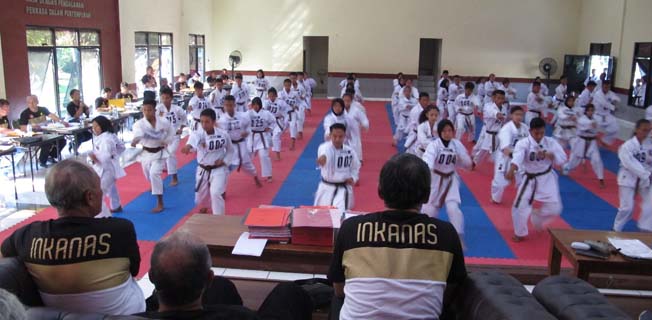 Tiga materi ujian Kihon (gerakan dasar), Kumite (pertarungan) dan Kata (keindahan jurus), dilahap oleh 420 peserta ujian satu per satu.