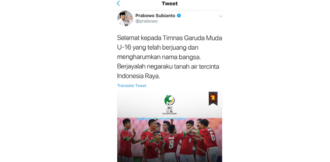 "Selamat kepada Timnas Garuda Muda U-16 yang telah berjuang dan mengharumkan nama bangsa. Berjayalah negaraku tanah air tercinta Indonesia Raya," kata Prabowo lewat Twitternya,