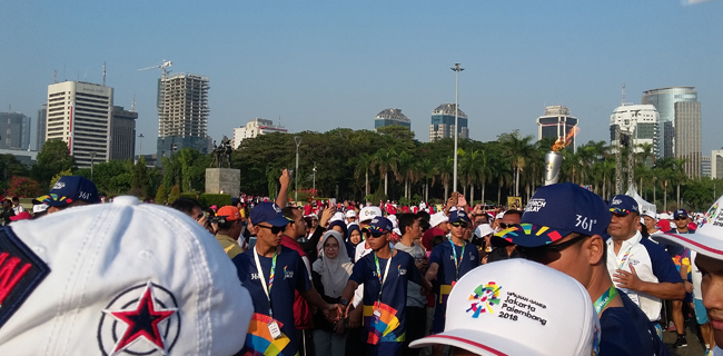 Sembari menunggu persiapan pawai obor, masyarakat yang sudah hadir terlihat melakukan senam bersama di pelataran Monas dengan memutar lagu 'meraih bintang' yang juga merupakan theme song Asian Games 2018.