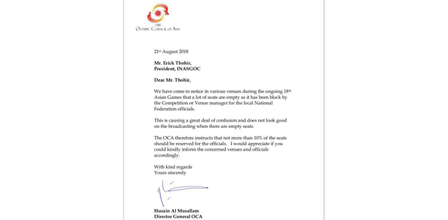 Dalam isi surat tertanggal Selasa (21/8) tersebut, OCA menyangkan kosongnya kursi-kursi di veneu saat pertandingan berlangsung. Hal ini menyebabkan tidak terlihat bagus saat siaran langsung karena kosongnya bangku penonton.
