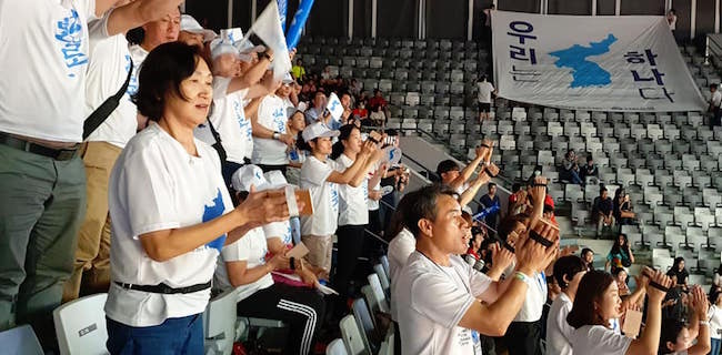 Dari kursi penonton, pendukung masing-masing tim juga berlomba memompa semangat para pemain. Pendukung Korea Bersatu membentangkan bendera Korea Bersatu dalam ukuran raksasa di salah satu pojok Istora di akhir pertandingan.