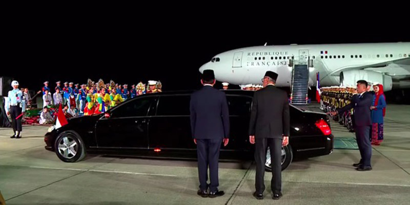 Dalam video yang ditayangkan akun YouTube Sekretariat Presiden, Macron dan istri dijemput mobil mewah buatan Jerman yang dipasangkan plat nomor warna merah dengan huruf putih bertuliskan 'France'.