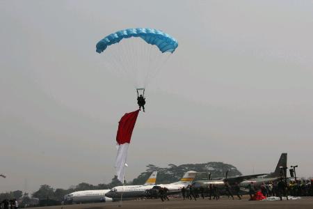 Bendera Merah Putih ukuran raksasa dibawa seorang penerjun anggota pasukan TNI yang mendarat tepat di tengah lapangan upacara dalam acara peringatan HUT ke 68 TNI di Skuadron 2 Lanud Halim Perdana Kusuma, Sabtu, (5/10). RAKYAT MERDEKA ONLINE