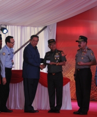 Presiden SBY usai menyampaikan sambutannya, dilanjutkan dengan launching BPJS Kesehatan dan penekanan tombol sebagai tanda pemantapan Migrasi dan Penyatuan Data Peserta Kesehatan Nasional di tandai dengan sirene dan pelepasan balon udara logo BPJS kesehatan sebagai tanda kesiapan operasional l Januari 2014.