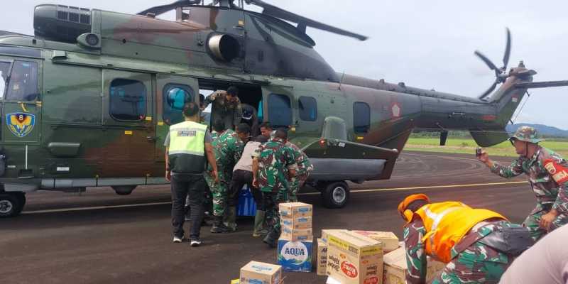 Helikopter yang dipiloti oleh Kapten Pnb Anterio bersama Letda Pnb Kevin itu mengangkut 2.200 kilogram logistik dalam dua sortie penerbangan menuju sejumlah titik terdampak.