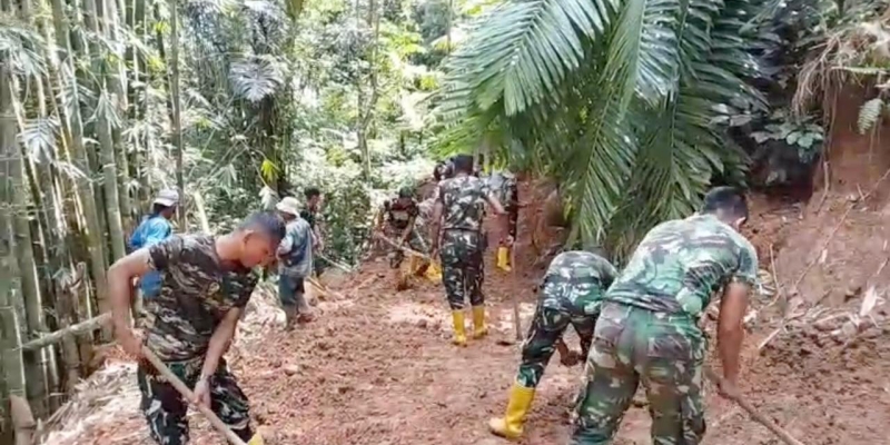 Dibantu masyarakat sekitar, personel TNI membersihkan jalanan dengan menggunakan cangkul pada Rabu, 24 Desember 2025. Hanya di beberapa titik alat berat eskavator dan truk TNI bisa masuk untuk membantu proses evakuasi.