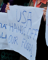 Perwakilan kelompok masyarakat sipil yang datang dari 31 negara tersebut membentangkan berbagai spanduk dengan tulisan tangan berisi seruan dan protes, antara lain "USA: Hands off our food'; 'No Negotiations in