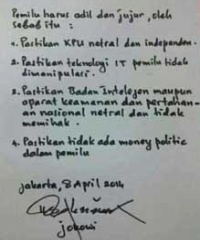 Tadi siang Jokowi mengeluarkan maklumat bahwa pemilu harus jujur dan adil. Maklumat ditulis tangan dan ditantadatangi langsung oleh Jokowi. Berikut maklumat Jokowi: