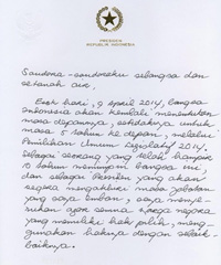 Dalam surat yang ditulis dengan tulisan tangan itu, SBY juga mengajak masyarakat Indonesia untuk sama-sama berdoa agar wakil rakyat yang akan duduk di kursi legislatif dapat menjalankan amanah dan mandat rakyat dengan baik.