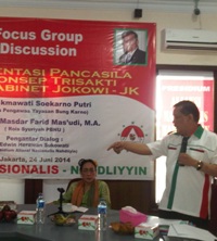 Demikian dikatakan Ketua Presidium Aliansi Nasionalis Nahdliyin (ANN), Edwin Henawan Soekowati. Edwin mengungkapkan hal itu saat membuka acara Forum Group Diskusi (FGD) Ideologi dengan Tema 'Implementasi Pancasila dan Konsep Trisakti Kabinet Jokowi-JK' bersama Rois Syuriah KH. Masdar F. Mas'udi, dan Ketua Umum PNI Marhaen, Hj. Sukmawati Sukarnoputri, di Graha ANN, Komplek Gudang Peluru Jakarta (Selasa, 24/6).