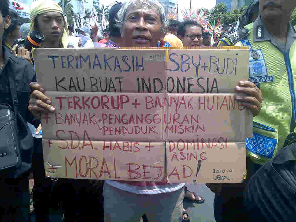 "Terima kasih SBY-Budi, kau buat Indonesia terkorup, banyak utang, banyak pengangguran, penduduk miskin, SDA habis, dominasi asing, dan moral bejad," tulis pria asal Duren Sawit itu yang mengenakan baju corak merah putih khas Madura.