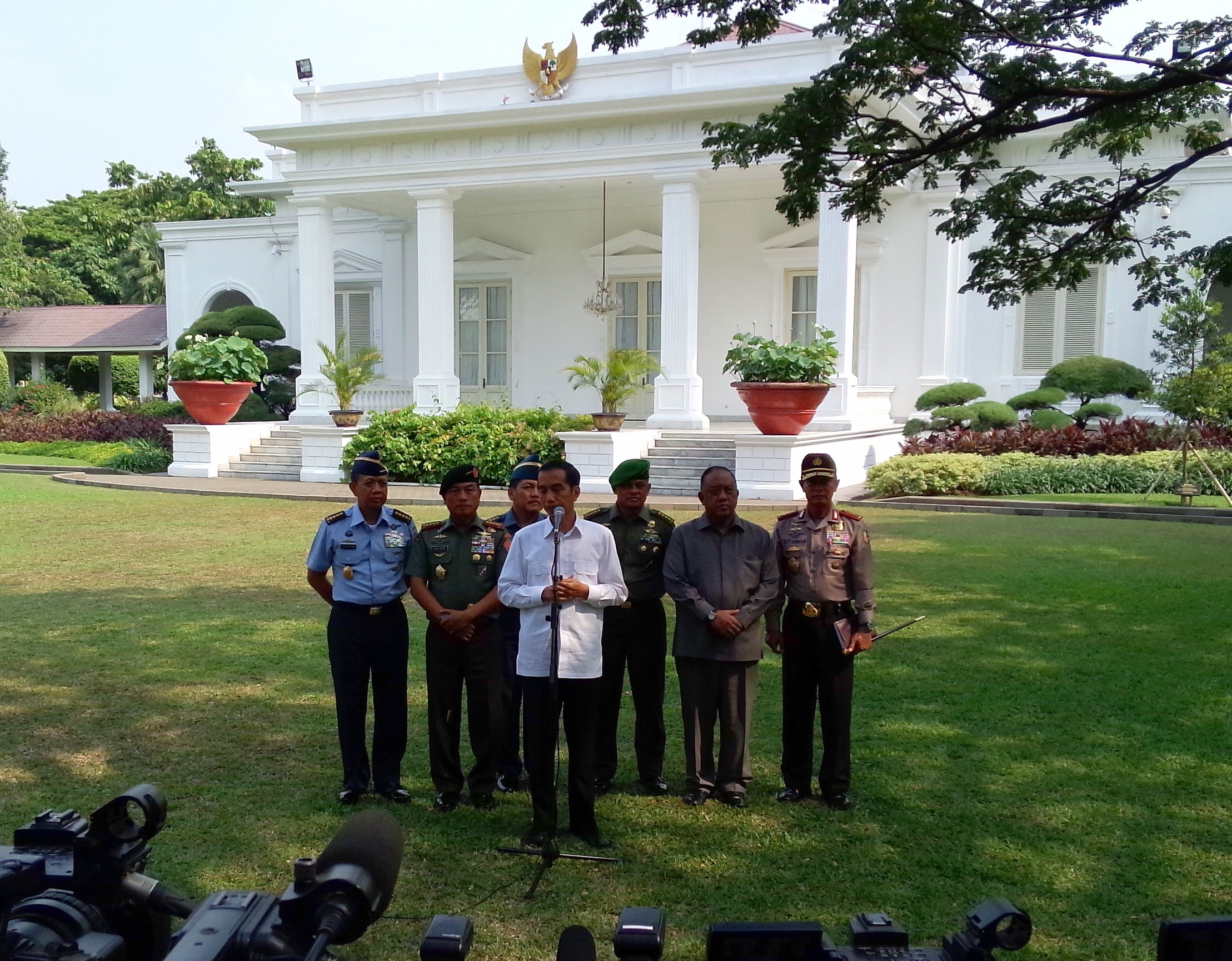 Jarak bicara Jokowi dan awak media hanya sekitar tujuh meter. Para awak media hanya dibatasi dengan tali pembatas merah.