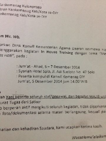 Dalam dokumentasi surat edaran yang diterima redaksi, diketahui bahwa seluruh peserta acara, yang juga terdiri dari pegawai Kemenag Kabupaten/Kota di provinsi Yogyakarta, diminta berkumpul di Kanwil Kemenag DIY pada pukul 14.00 WIB tadi. Acara ini bersifat wajib bagi seluruh staf atau pegawai.