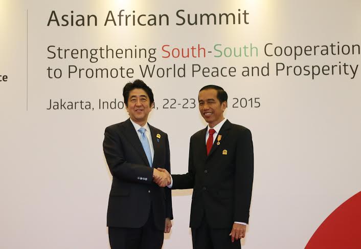 Hingga kini Presiden Joko Widodo dan saya telah tiga kali mengadakan pertemuan tingkat tinggi yang telah membuahkan hasil, dan kami telah menyepakati komitmen untuk memperkuat "Kemitraan Strategis" yang didukung oleh kelautan dan demokrasi berasaskan kerja sama saling menguntungkan, hubungan persahabatan yang baik, serta adanya kesamaan nilai-nilai dasar yang kita miliki. Kita telah meluncurkan program kerja sama bertajuk "PROMOSI: Program Promosi Investasi dan Ekspor Jepang-Indonesia."