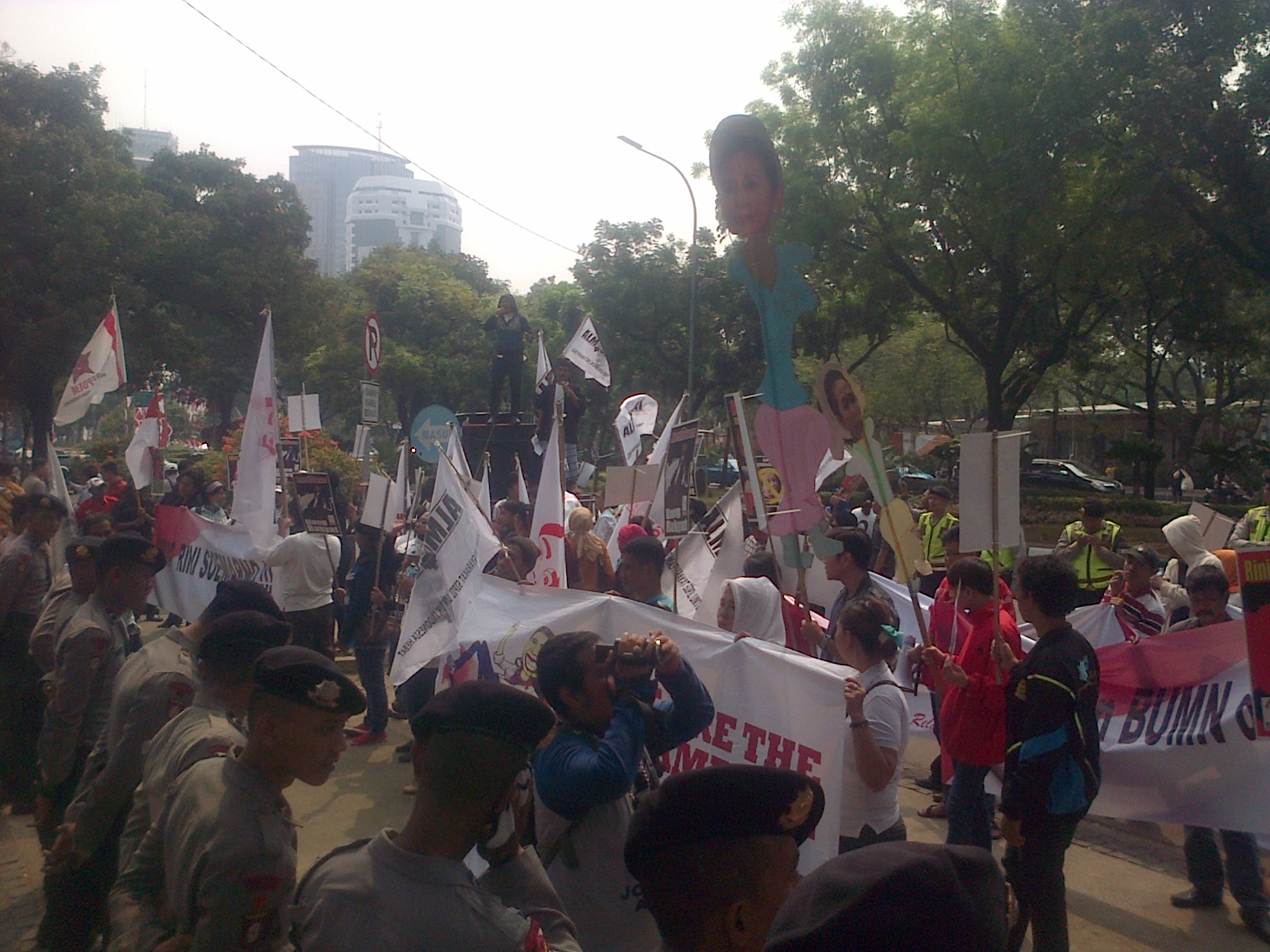 Ratusan demonstran yang mengatasnamakan relawan Jokowi beraksi di depan kantor Kementerian Badan Usaha Milik Negara (BUMN) pimpinan Rini Sumarno di Jalan Medan Merdeka Selatan, Jakarta Pusat, Kamis (20/8). Mereka menuntut agar Jokowi segera mencopot Menteri Rini karena dianggap koruptor kelas kakap, calo anggaran, hingga menteri yang membelot dari cita-cita nawacita Jokowi. Ihsan Dalimunthe/RMOL