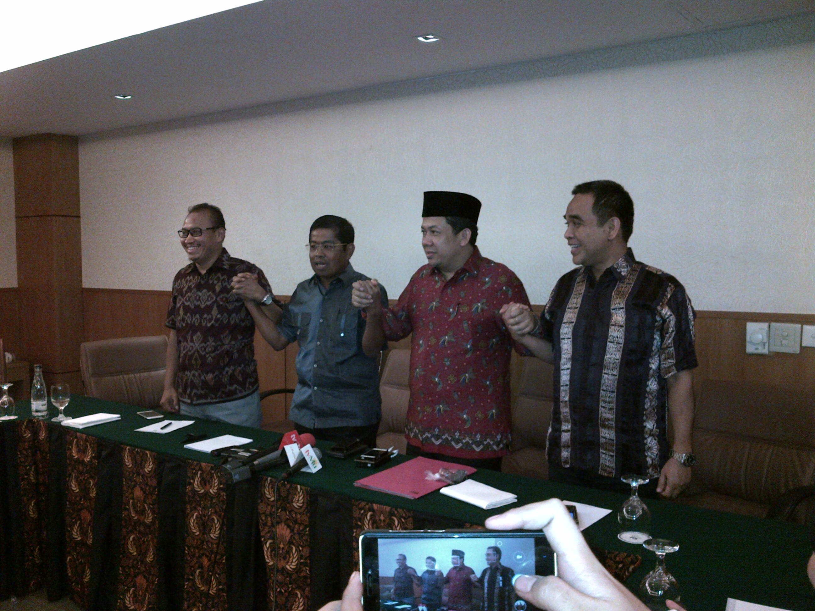 Sekjen PKS Taufik Ridho, Sekjen Golkar Idrus Marham, Wasekjen PKS Fahri Hamzah, dan Sekjen Gerindra Ahmad Muzani (kiri ke kanan) hadir dalam pertemuan Koalisi Merah Putih (KMP) di Hotel Sultan, Jakarta (Kamis, 3/9). Pertemuan ini tidak dihadiri oleh PAN yang telah bergabung dengan pemerintah dan PPP. Wahyu Sabda Kuncahyo/RMOL