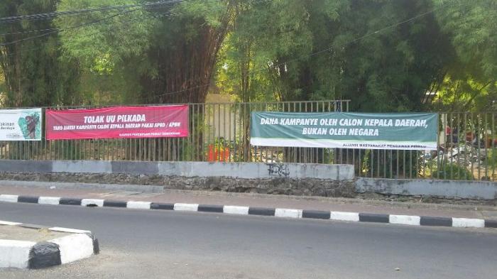 Spanduk yang bertuliskan penolakan negara mendanai kampanye calon kepala daerah (cakada) bahkan masih banyak terpampang di berbagai ruas jalan raya Jakarta sejak Senin (13/9) hingga saat ini.