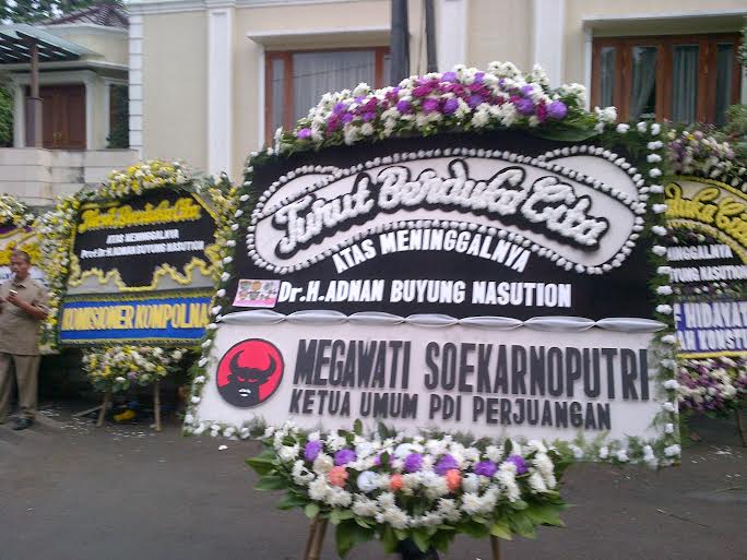 Nama-nama beken tertera di karangan bunga yang berbaris rapi. Semuanya mengucapkan belasungkawa dan duka cita mendalam. Tersebut nama Ketua MPR Zulkifli Hasan, Ketua DPR Setya Novanto, Presiden Joko Widodo, Wapres Jusuf Kalla, Komisi Kepolisian Nasional, Komisi Pemilihan Umum. Ada juga dari Presiden RI ke-V Megawati Soekarnoputri, tak ketinggalan dari media massa yang kerap menjadikan almarhum sebagai nara sumbernya seperti ANTV sampai Pos Kota.