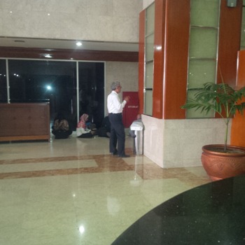 Karena tidak ada kursi di lobi, para pengunjung "bertebaran" di setiap sudut. Ada yang duduk lesehan, ada yang berdiri sambil ngobrol. Memang, selama ini sudah biasa duduk lesehan di lobi DPR.