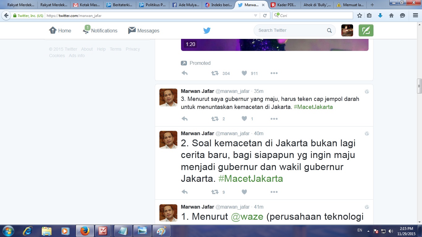 "Menurut saya gubernur yang maju, harus teken cap jempol darah untuk menuntaskan kemacetan di Jakarta," kicau Marwan lagi.