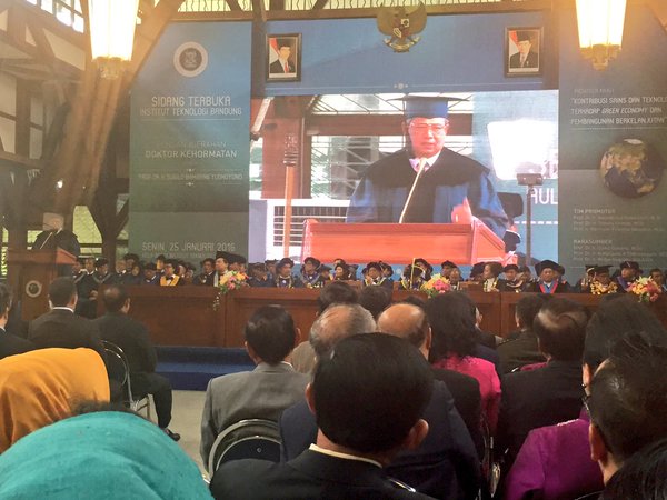 "Saya senang penghargaan ini didapat ketika saya tidak menjabat lagi sebagai presiden," kata SBY saat menyampaikan pidato ilmiahnya bertajuk "Kontribusi Sains dan Teknologi‎ Terhadap Green Economy dan Pembangunan Berkelanjutan", di Aula Barat ITB, Jalan Ganesha Bandung, Senin (25/1).