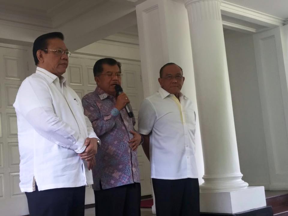 Wakil Presiden yang juga politisi senior Partai Golkar, Jusuf Kalla menerima Aburizal Bakrie dan Agung Laksono di Rumah Dinas Wapres, Jalan Diponegoro, Menteng, Jakarta Pusat, Rabu (3/2).