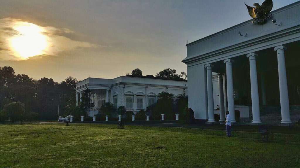 Sekitar beberapa menit lalu, foto presiden mengenakan sarung di halaman Istana Bogor sambil melihat langit dan matahari diunggah pengelola twitter presiden.