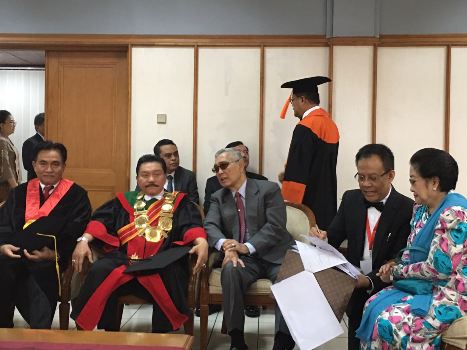 Mantan Menteri Kehakiman dan HAM Kabinet Gotong Royong, Yusril Ihza Mahendra menghadiri acara penganugerahan gelar Doktor Kehormatan atau Honoris Causa (H.C) dalam bidang ilmu politik dan pemerintahan kepada Presiden Kelima RI yang juga Ketua Umum PDI Perjuangan, Megawati Soekarnoputri dari Universitas Padjadjaran (Unpad), di Kampus Unpad, Bandung, Jawa Barat, Rabu (25/5).