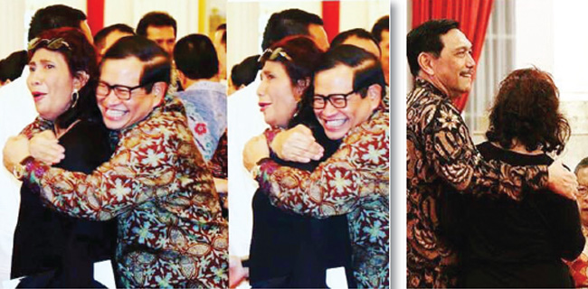 Pemilik maskapai Susi Air ini berkeliling, menyapa sana sini. Hampir semua menteri disapa termasuk Panglima TNI dan Kapolri. Nah, giliran menyapa Seskab Pramono Anung, terlihat keduanya mengobrol sedikit lama. Entah apa yang dibicarakan, namun keduanya terlihat tertawa lepas sekali. Terbahak. Malah Pram membalas candaan Susi dengan memeluknya dari belakang. Usai menyapa Pram, Susi lanjut mendekati Luhut Panjaitan. Dari sana keduanya pun terlihat mengobrol. Luhut membalasnya dengan merangkul Susi.