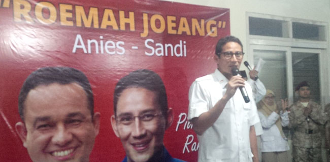 Begitu kata bakal calon wakil gubernur DKI Jakarta Sandiaga Uno dalam deklarasi Roemah Joeang Anies-Sandi di Jalan Brawijaya, Jakarta, Senin malam (26/9).