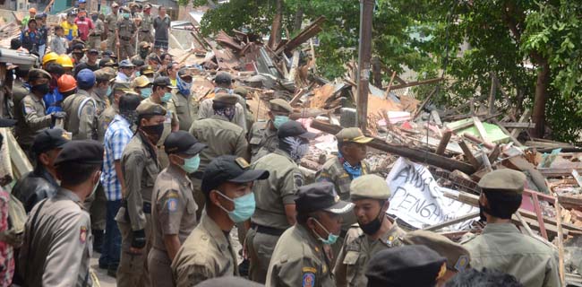 Proses pembongkaran rumah warga Bukit Duri, Tebet, Jakarta, Rabu (28/9). Pemerintah Provinsi DKI Jakarta menggusur bangunan yang berbatasan langsung dengan sungai Ciliwung dan akan merelokasi warga ke Rusun Rawa Bebek. Putu Wahyu Rama/RM