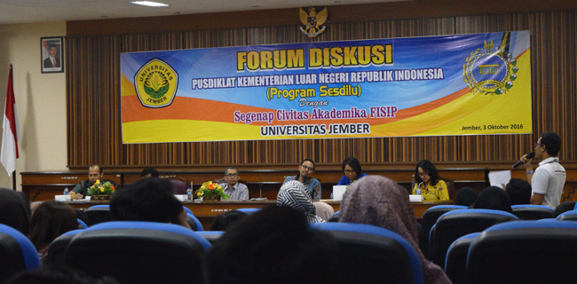 Forum dihadiri oleh sekitar 170 civitas akademika yang terdiri dari staf pengajar dan mahasiswa Fakultas Ilmu Sosial dan Ilmu Politik (FISIP) Universitas Jember. Sebagai narasumber Forum tersebut adalah lima orang peserta pendidikan dan latihan Sekolah Staf Dinas Luar Negeri RI (Sesdilu) angkatan ke-57 Kementerian Luar Negeri RI, yaitu Ahmad Syofian, Dini Apliana, Enjay Diana, I Gusti Agung Ayu Ratih Astary, dan Landry Haryo Subianto.