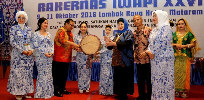 Menteri Koperasi dan UKM Puspayoga mewakili Wapres Jusuf Kalla meresmikan pembukaan Mukernas Ikatan Wanita Pengusaha Indonesia (Iwapi) ke-XXVI yang ditandai dengan pemukulan rebana di Mataram, Nusa Tenggara Barat (Senin, 10/10). Mukernas Iwapi ini dihadiri sebanyak 1300 peserta dari 34 Provinsi. Kemenkop UKM