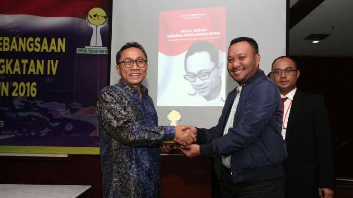 Ketua MPR, Zulkifli Hasan mendapat plakat usai bicara pada Diklatnas 'Pendidikan Nilai Nilai Kebangsaan Himpunan Pengusaha Muda Indonesia (HIPMI) Angkatan IV di Lemhanas, Jakarta (Senin, 10/11). Dalam kesempatan ini, Zulhas mengatakan bahwa tujuan demokrasi adalah kesejahteraan. Titik tekannya bukan hanya demokrasi sebagai prosedur politik, tapi sampai pada substansinya yaitu demokrasi ekonomi untuk kemakmuran bersama. MPR